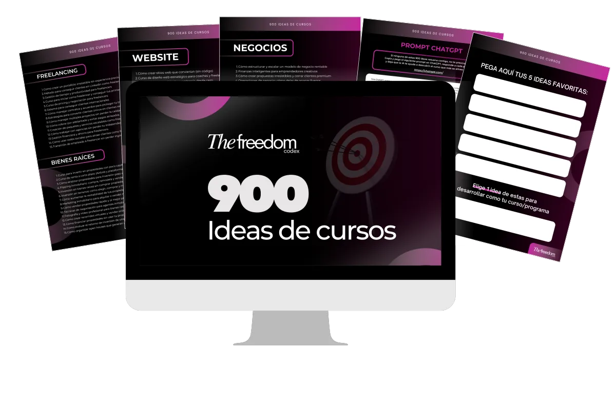 900 ideas de cursos organizadas por nichos rentables: negocios, salud, idiomas, creatividad, tecnología, desarrollo personal y más.